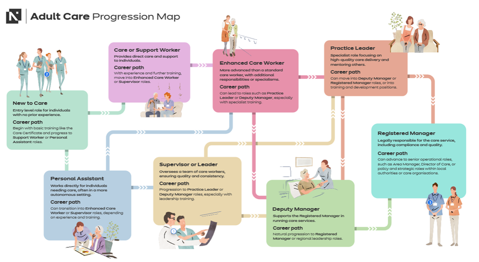 This will help you easily see what skills are expected in this role and what training can support learners' development. It can also help learners see how they can progress to the next stage of their career in adult social care.